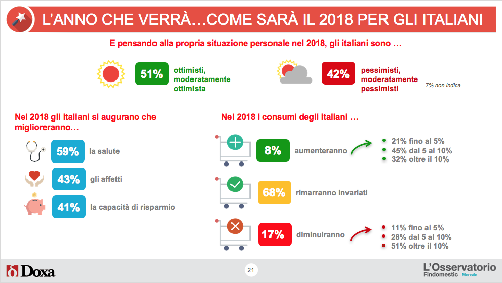 se ben il 59% si augura di vivere un 2018 in piena salute, il 43% ha come priorità la serenità della vita affettiva e sentimentale e il 41% sogna un anno all’insegna della sicurezza economica.