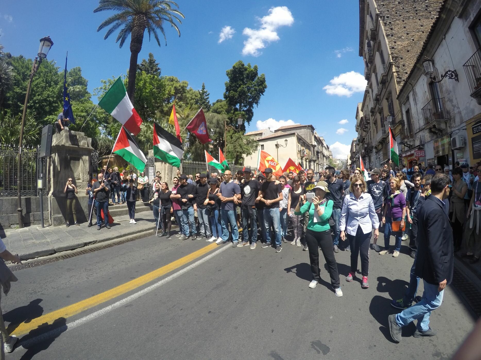 Centinaia di persone a Catania hanno manifestato alla prima tappa italiana del Giro D’Italia per denunciare la partenza dai territori occupati da Israele con ben tre tappe. Il presidio ha cercato di percorrere la via principale di Catania dove di li’ a poco sarebbe passato il Giro e in direzione della piazza Duomo da cui stava per partire la gara. Dopo alcune centinaia di metri alcune cariche della polizia hanno bloccato il corteo spontaneo solidale con il Popolo palestinese. Si sarebbero registrati alcuni feriti lievi tra i manifestanti. La partenza del Giro e’ stata ritardata di alcuni minuti avendo il presidio bloccato la via di transito. Diversi slogan tra cui “Israele e’ terrorista, che lo sappia ogni ciclista”, “dalla Sicilia alla Palestina, un solo grido: America assassina” e “Israele assassino”. Intanto dalla piazza della partenza una grande bandiera palestinese e’ stata fatta sventolare da un palazzo, e’ stato esposto uno striscione e alcune migliaia di volantini con scritto “Israele assassino” e “Palestina libera” sono stati lasciati cadere sulla folla.