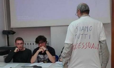 Una storia che si lega a quella di Milano arriva da Palermo, dove un docente dell’Università del capoluogo siciliano della facoltà di Lingue, durante la sua lezione, ha indossato una maglietta con la scritta “Io sono omosessuale” e sulle spalle un’altra frase “Siamo tutti omosessuali”. Il professore Andrea Cozzo, 60 anni, ha voluto così esprimere il suo dissenso rispetto alla decisione dell’Università di Verona che ha annullato un convegno su “Richiedenti asilo orientamento sessuale e identità di genere“, previsto per oggi.