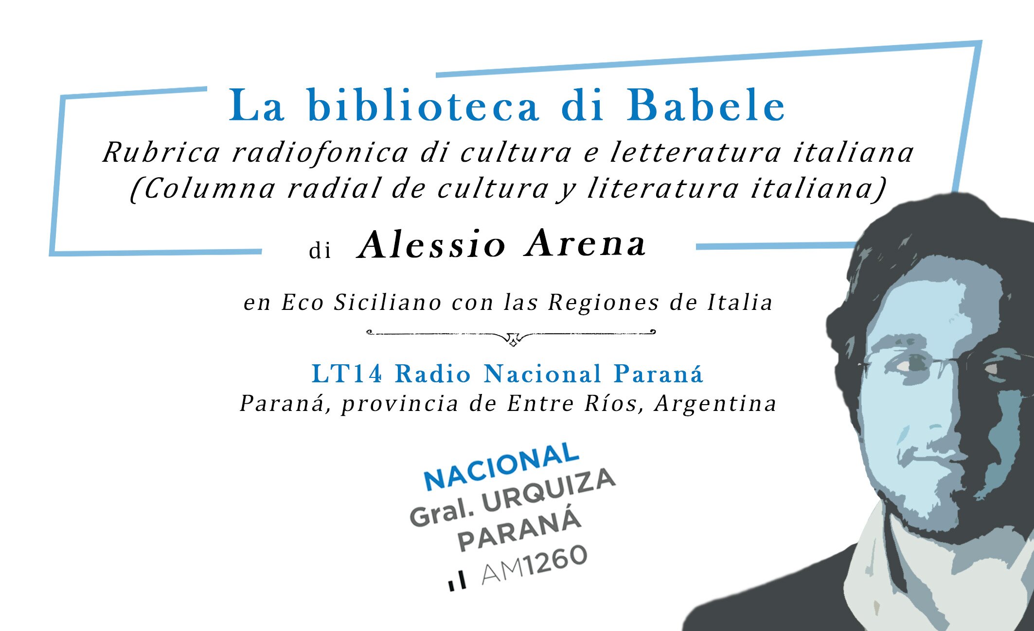 Il poeta palermitano Alessio Arena, già vincitore del Premio Internazionale “Salvatore Quasimodo” e candidato al Premio Nobel per la Letteratura dal 2017, condurrà dal 17 aprile 2018 una rubrica dedicata alla cultura e alla letteratura italiana, intitolata “La biblioteca di Babele”, per il programma Eco Siciliano con las Regiones de Italia, condotto da Francisco Bolzán e José Prestifilippo, che andrà in onda dalle ore 13:00 alle 14:00 tutte le domeniche sulla Radio Nazionale argentina (AM 1260, Radio Nacional).