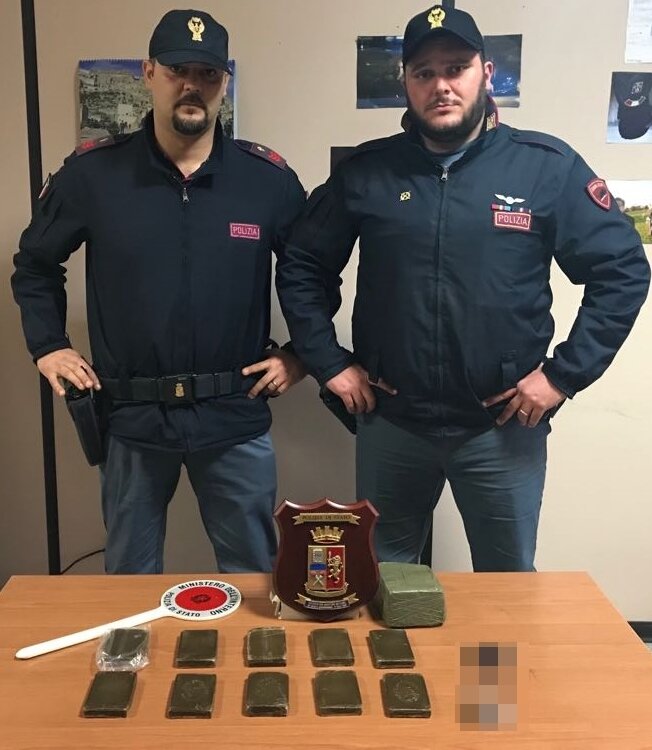 E’, così, scattata una scrupolosa perquisizione che ha consentito di rinvenire, sotto il sedile del passeggero, una busta in plastica con all’interno un involucro a forma di parallelepipedo, imballata con del nastro adesivo, contenete sostanza stupefacente del tipo hashish, dal peso complessivo di circa Kg. 1.